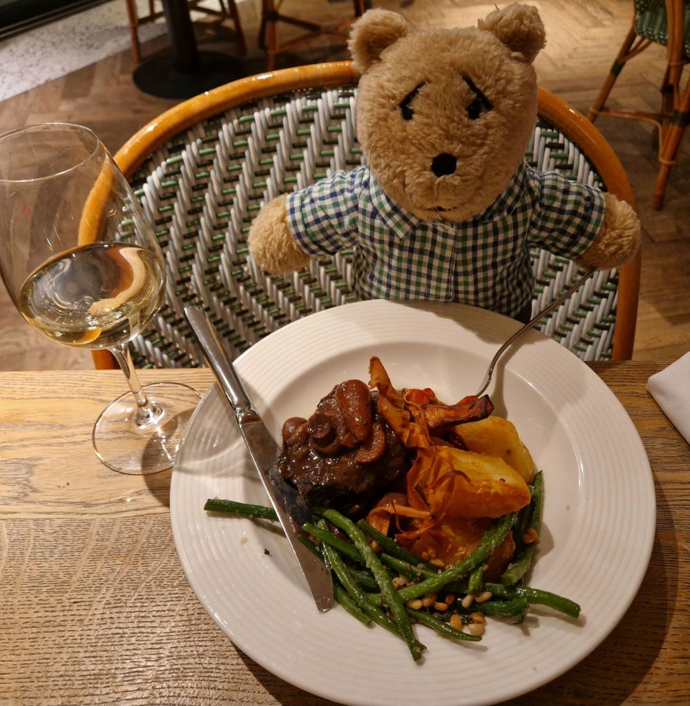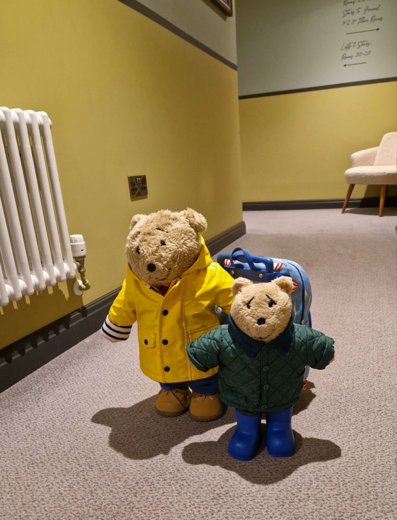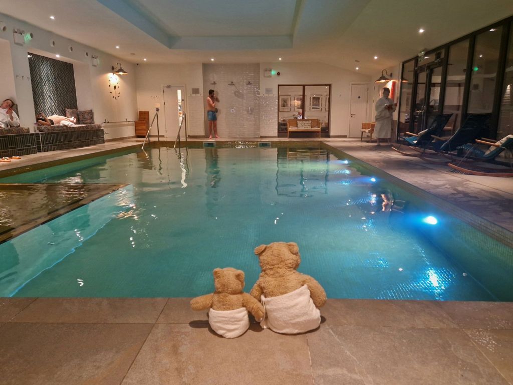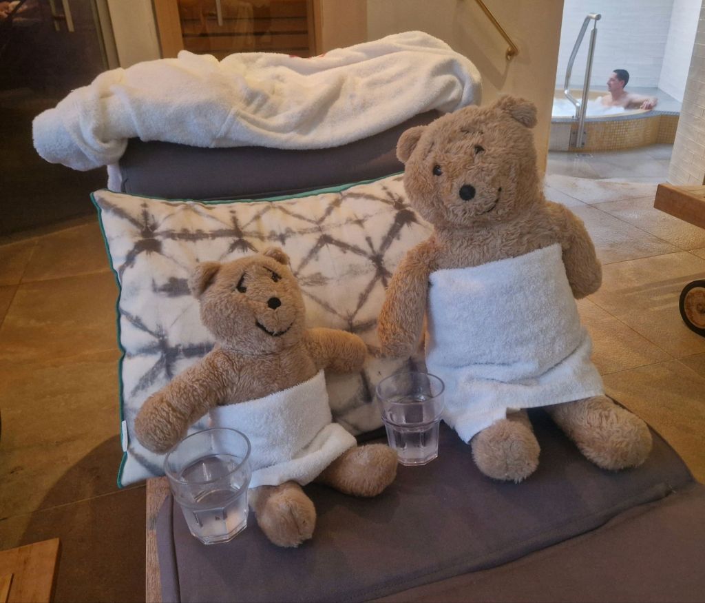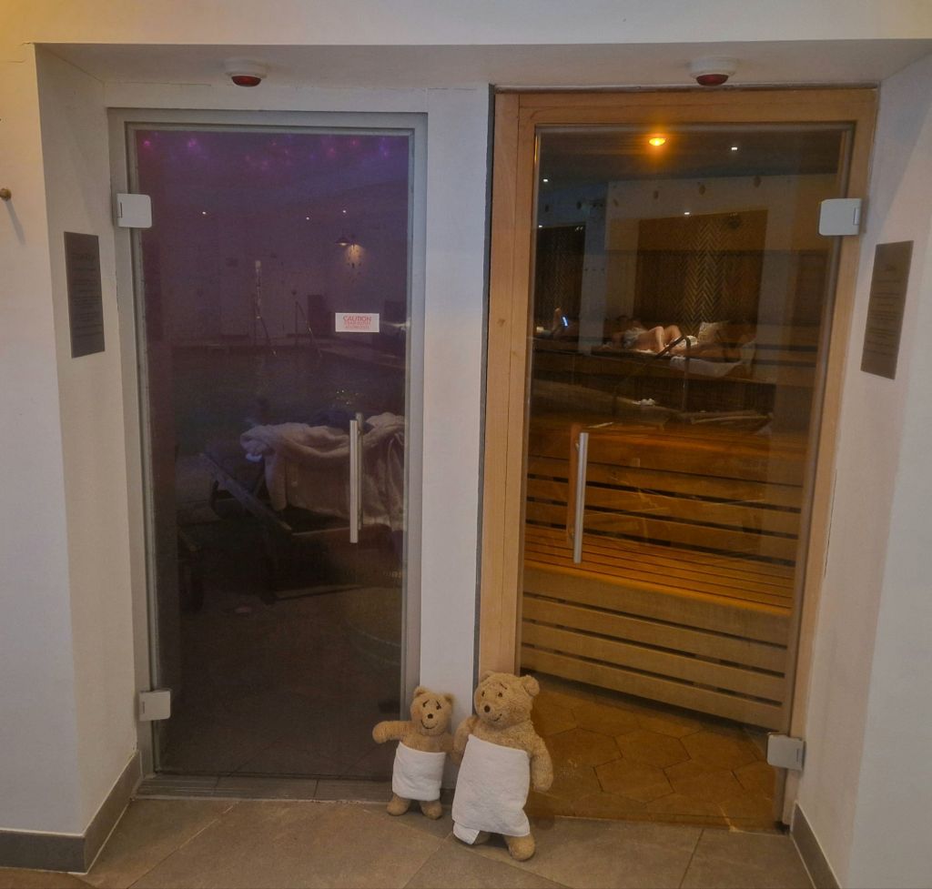 I visited the spa on a previous visit and told Nye that it wasn’t really a good place for bears as it involved lots of water and steam. However it was tipping with rain outside and blowing a gale, so we went to the spa. The pool looked very pleasant but we can’t go in water as it makes our stuffing heavy, which would make us sink, so we just looked….