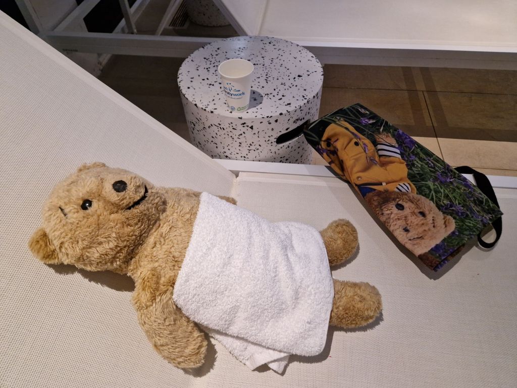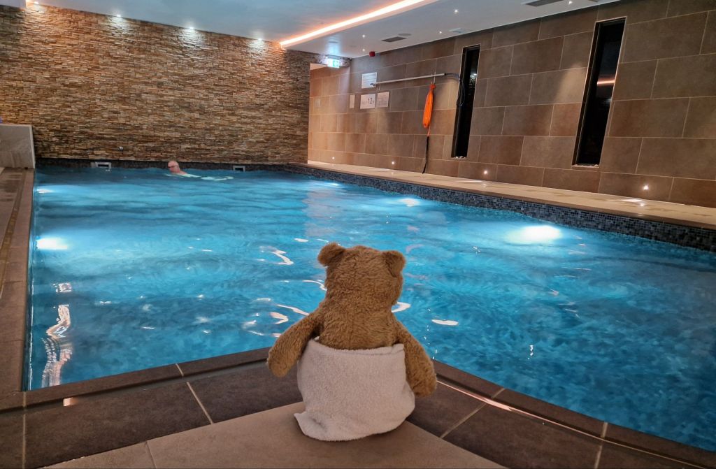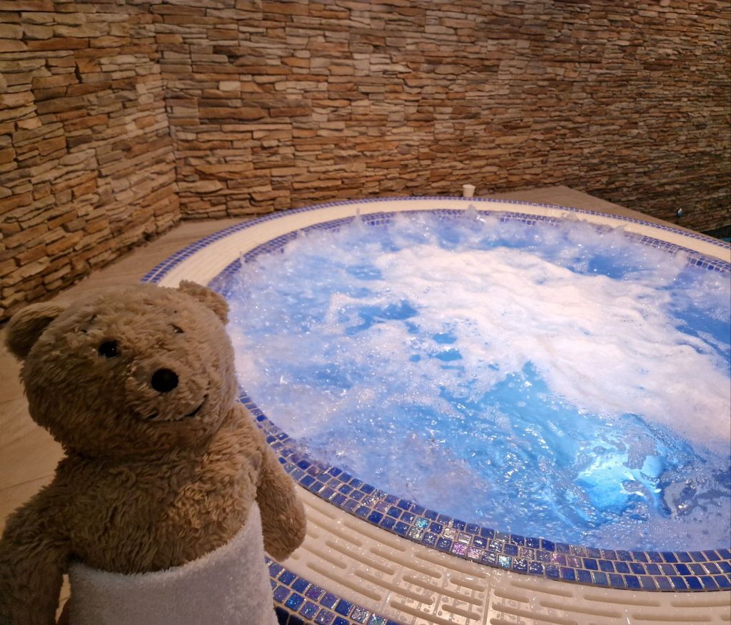 I visited the spa on a previous visit and told Nye that it wasn’t really a good place for bears as it involved lots of water and steam. However it was tipping with rain outside and blowing a gale, so we went to the spa. The pool looked very pleasant but we can’t go in water as it makes our stuffing heavy, which would make us sink, so we just looked….