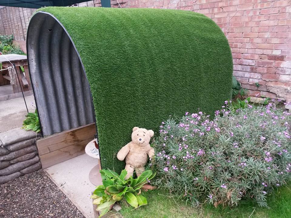 We weren’t outside for long as my humans though it looked like a good place. Karen likes sitting outside, even if rain is imminent (which it was) so she asked to be seated in the garden. I was very surprised to find a little grass topped steel shelter out there with sandbags all around it. Apparently it was an old air raid shelter; during the 2nd World War, long before I was made in the 1940’s people used to sit in them when bombs were being dropped which must have been very scary.