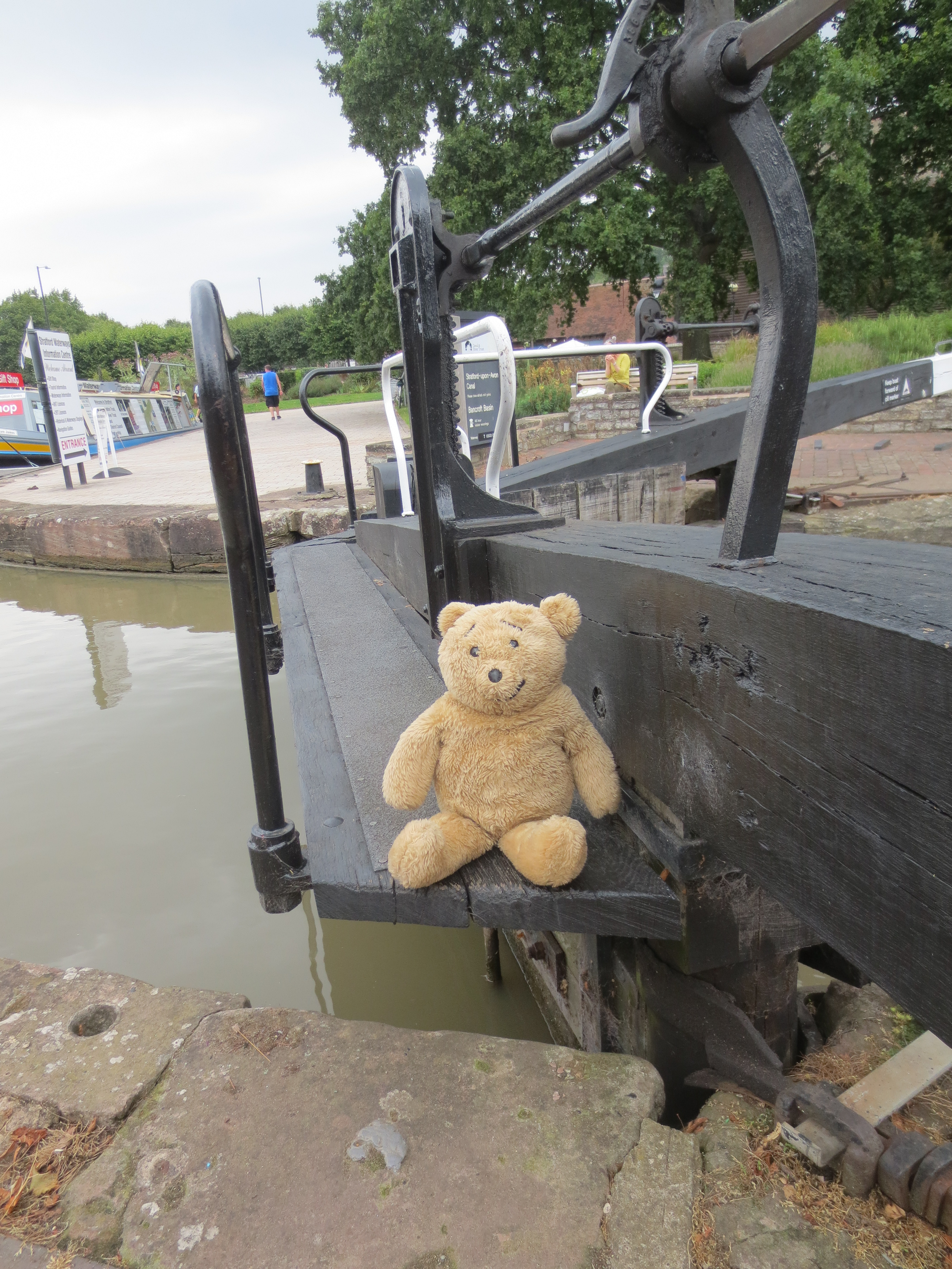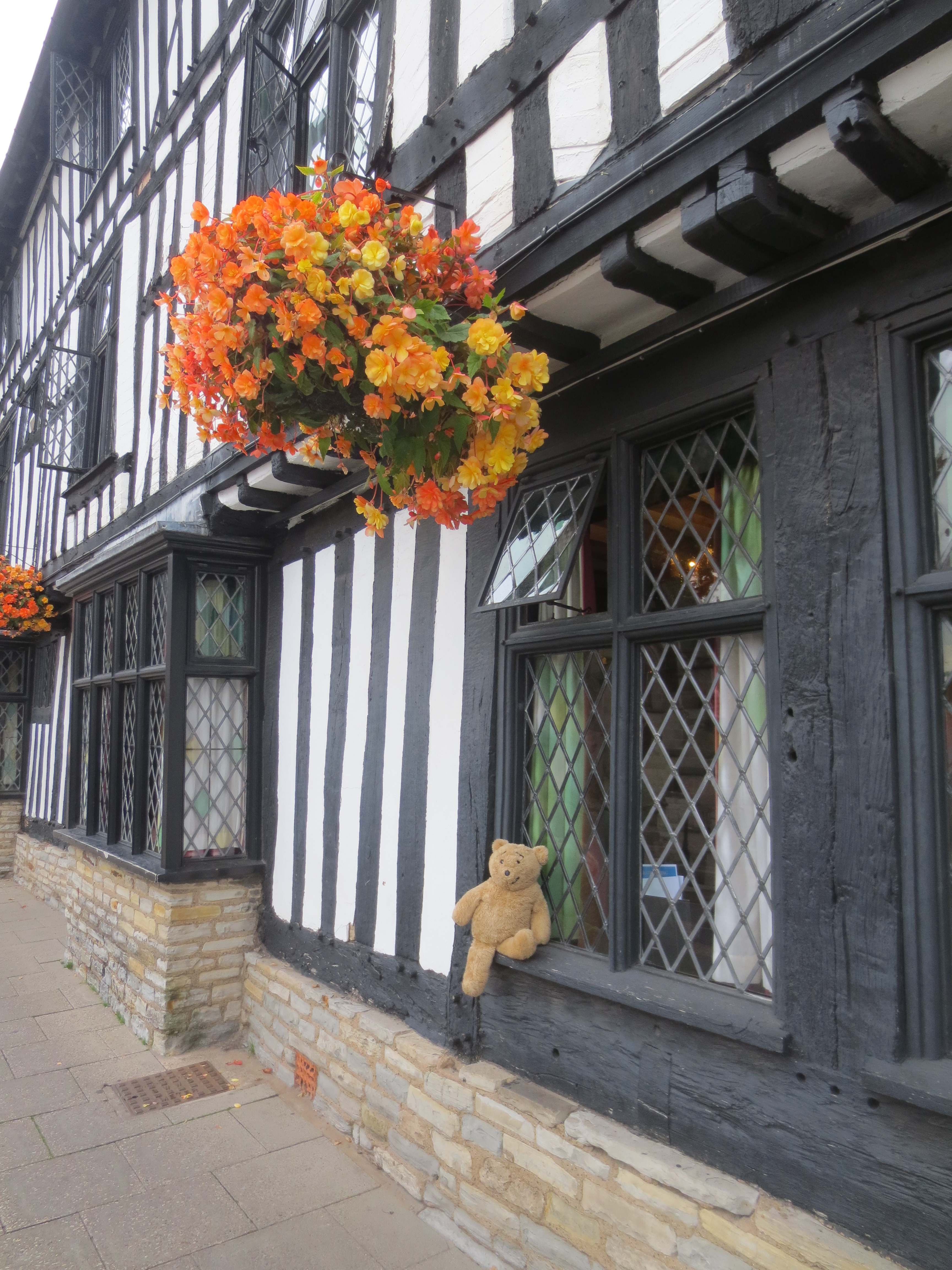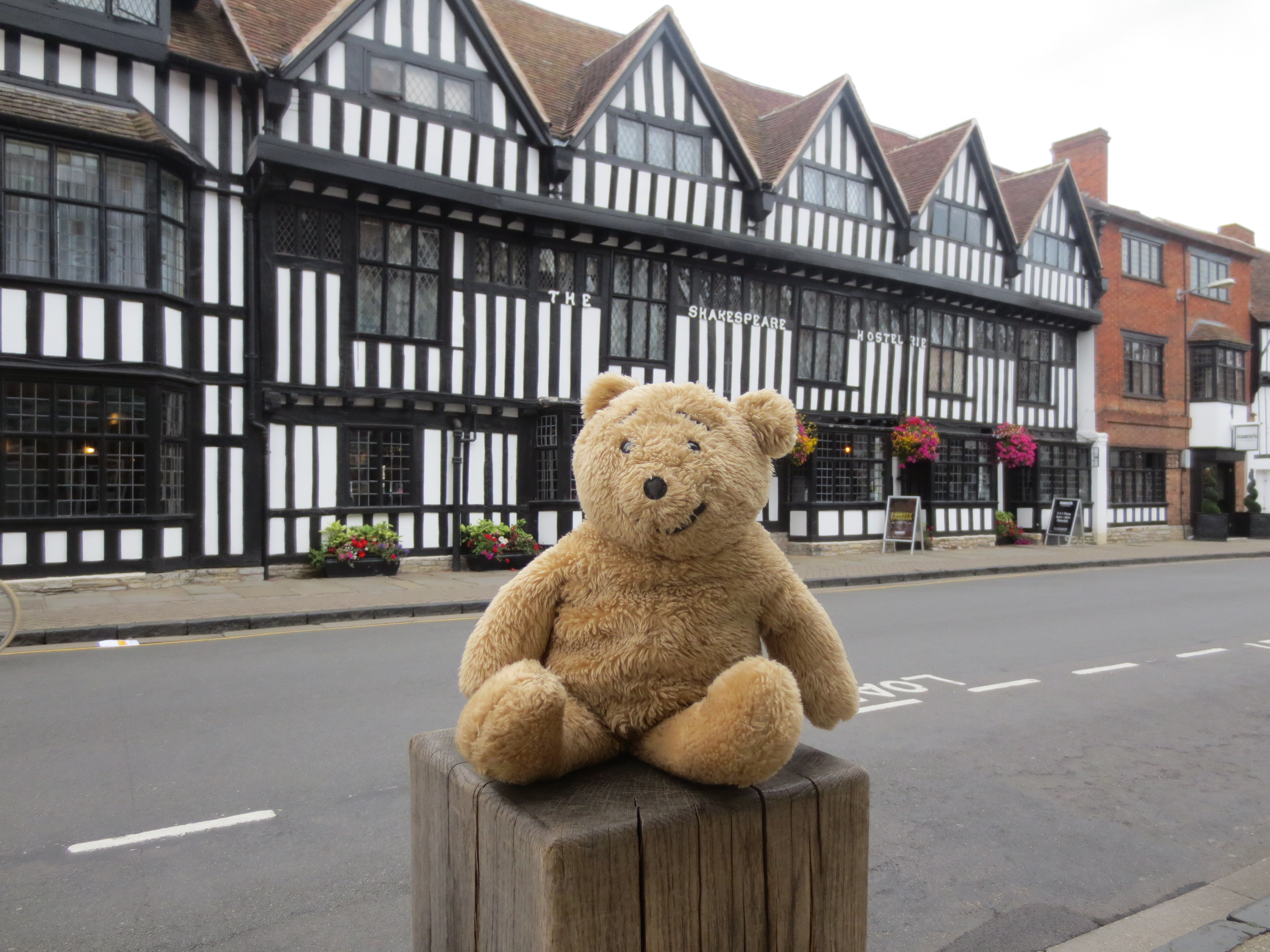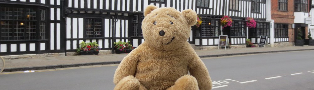 I recently visited Stratford-on-Avon and thought it a splendid place for bears and their humans as it is very interesting. I was a bit worried about some of the buildings that seemed wibbly wobbly looking, but Karen said they wouldn’t fall down as they have been there looking a bit crooked for over 300 years.