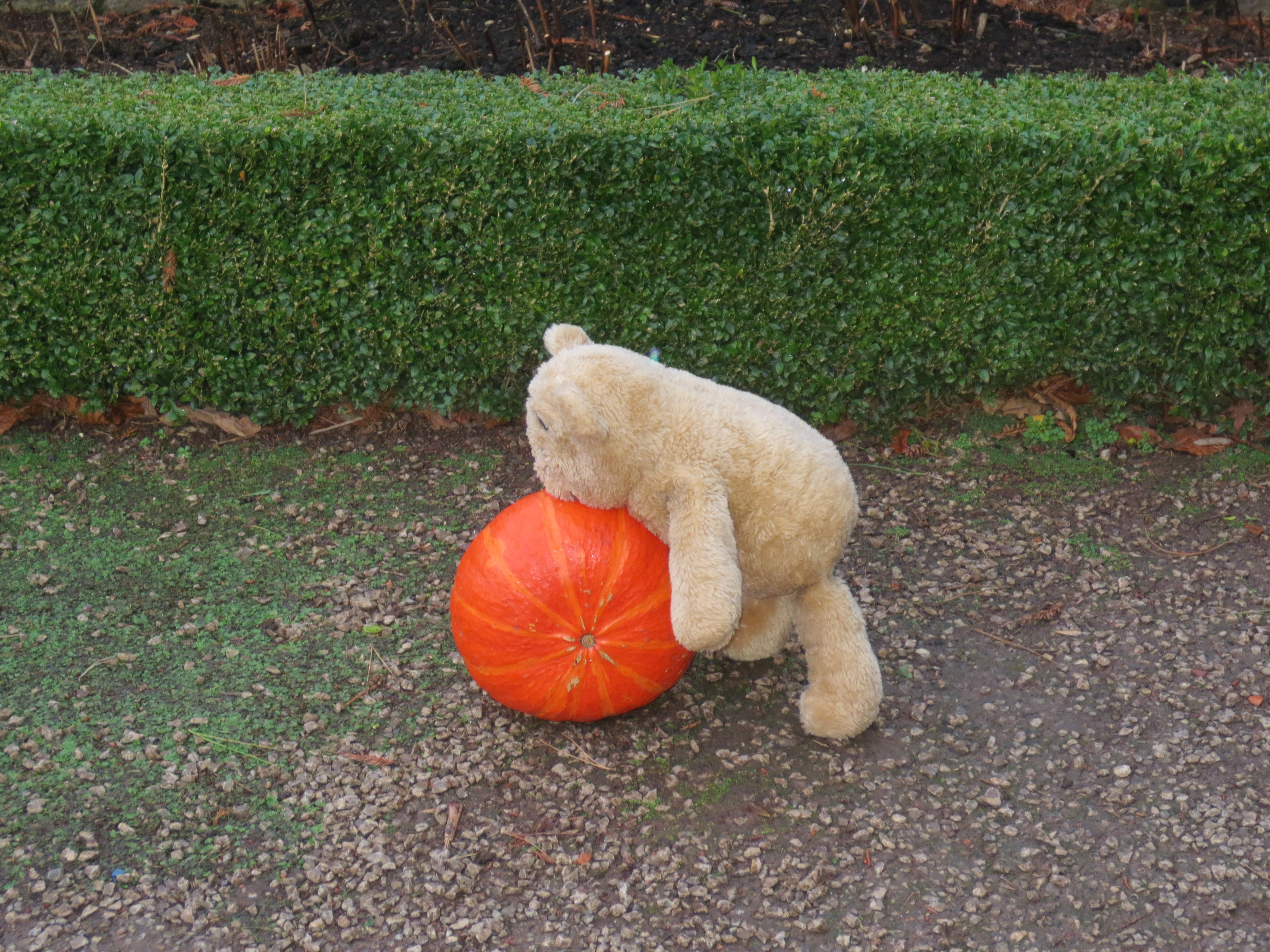Carrying a pumpkin and a squash is hard work for a little bear like me (though my humans did give me a helping hand from time to time). I had to stop and rest frequently. I decided it would be easier to roll the squash along the ground, but my little legs became more and more tired.