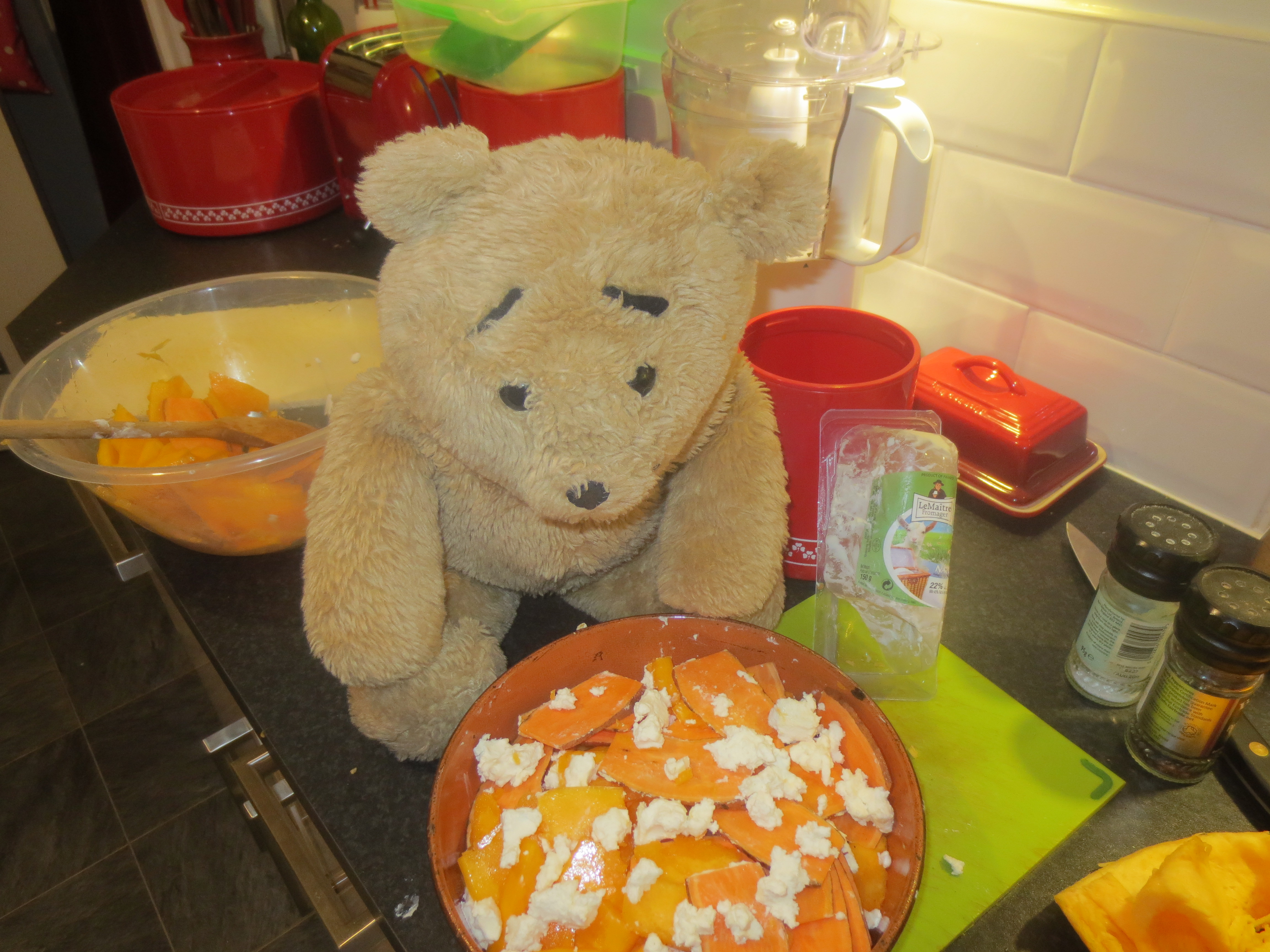 The next stage was to crumble some goat’s cheese all over the layer, but Karen did this for me as the cheese would have made my paws very messy indeed.