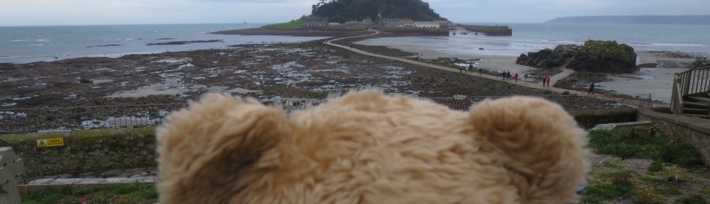 I was hoping the tide would be in which would have meant a little boat trip to get to the tiny island St Michael’s Mount which is next to Marazion in Cornwall. IMG_9818The tide was out though so I climbed into the bear carrier for the trip as the surface looked a bit wet and I didn’t have any wellington boots with me.IMG_9822When the tide is in people and bears can cross using this strange boat with wheels which is called an amphicraft.IMG_9843The St Aubyn Family have lived on St Michael’s Mount since the 17th Century, though  in 1954, the 3rd Baron St Levan gave most of St Michael’s Mount to the National Trust though they kept a 999 year lease (which is a very long time) to live in the castle and manage public viewing of the historic rooms (source Wikipedia). National Trust members and their bears can visit for free as long as they show their membership cards….IMG_9846As we climbed up to the castle I stopped to have a little rest then Karen pointed out to me that I was right next to The Giant’s Well.  I didn’t stay there long.IMG_9850I climbed up into a little window in a wall that I thought might make a good place to hide from giants.IMG_9854Further on I came across some battlements with a row of cannons.  After clambering up onto one I could see a lovely view of the sea.  IMG_9856Just in front of the castle I paused to take a ‘selfie’.IMG_9859It was a long tiring trek to the front door.  IMG_9862I was rather hesistant entering as just inside the door there was a bear much bigger than me with very big teeth.  IMG_9863The views from inside are amazing.  I was jolly pleased that my human had put her coat in the bear carrier which turned it into a pillow to stand on.IMG_9865In one of the rooms I spotted a rather grumpy looking dog.IMG_9867On the roof terrace there was a very old thermometer which was a tad confusing to read  as it was in Farenheit instead of Centigrade.  In between freezing and temperate seemed about right though!IMG_9869I peered over to have a look at the sea which seemed to make the humans a bit nervous.IMG_9870The gardens looked splendid.IMG_9880Back inside I noticed that the Queen had visited recently. IMG_9882Being a bear I am sometimes able to go places where humans cannot.  I had a peak up this very old staircase, but at the top there was a piece of glass and I couldn’t go any further.IMG_9885They are well prepared for any fires that might break out.  These buckets were full of sand.IMG_9886On returning to the outside we came across more battlements and smaller cannons.  In the past these would have been used to defend the island.IMG_9890All the climbing and walking around made me very hungry.  I was very pleased to find a cafe.  The Sail Loft make very yummy celeriac soup.IMG_9894