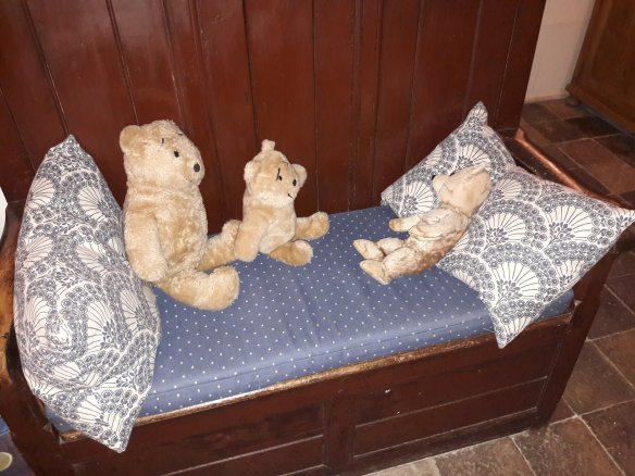 There are two wood burning stoves at Treleddyd Fawr. Here we are watching a logburn in the biggest one. There are the remains of a bread oven next to it and the chimney up above is very big and wide. The National Trust restored the fireplace with a new oak lintel which was grown at Colby Woodland Garden nearby. (See my blog: https://horacethealresfordbear.com/2019/03/27/colby-woodland-garden-in-early-spring/ )