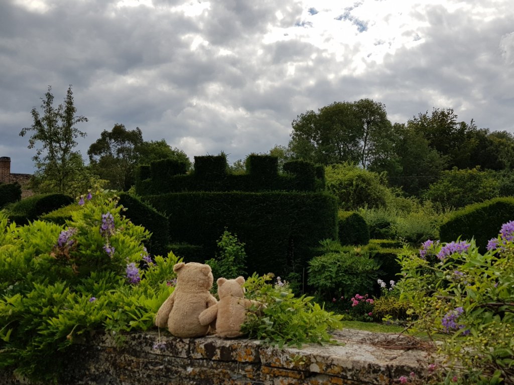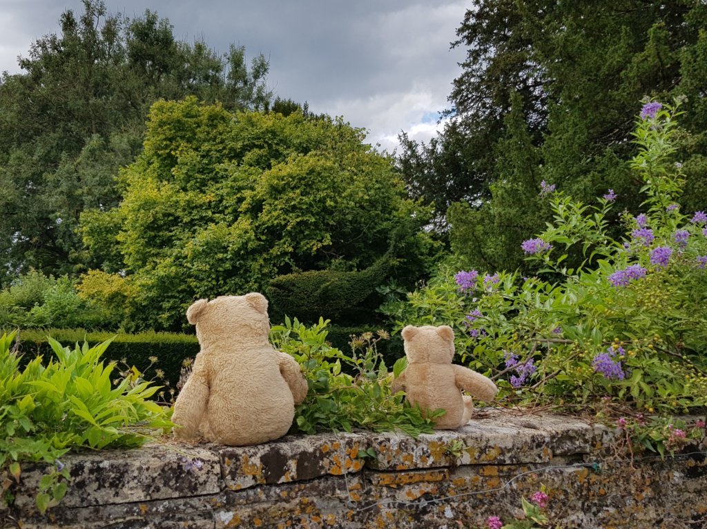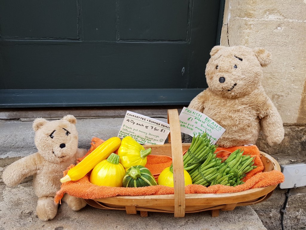 Further along there was a trug full of very beautiful vegetables for sale. Again we popped some money through the letterbox for some green beans and summer squashes. Fortunately the humans were happy to carry them as they were rather heavy for small bears