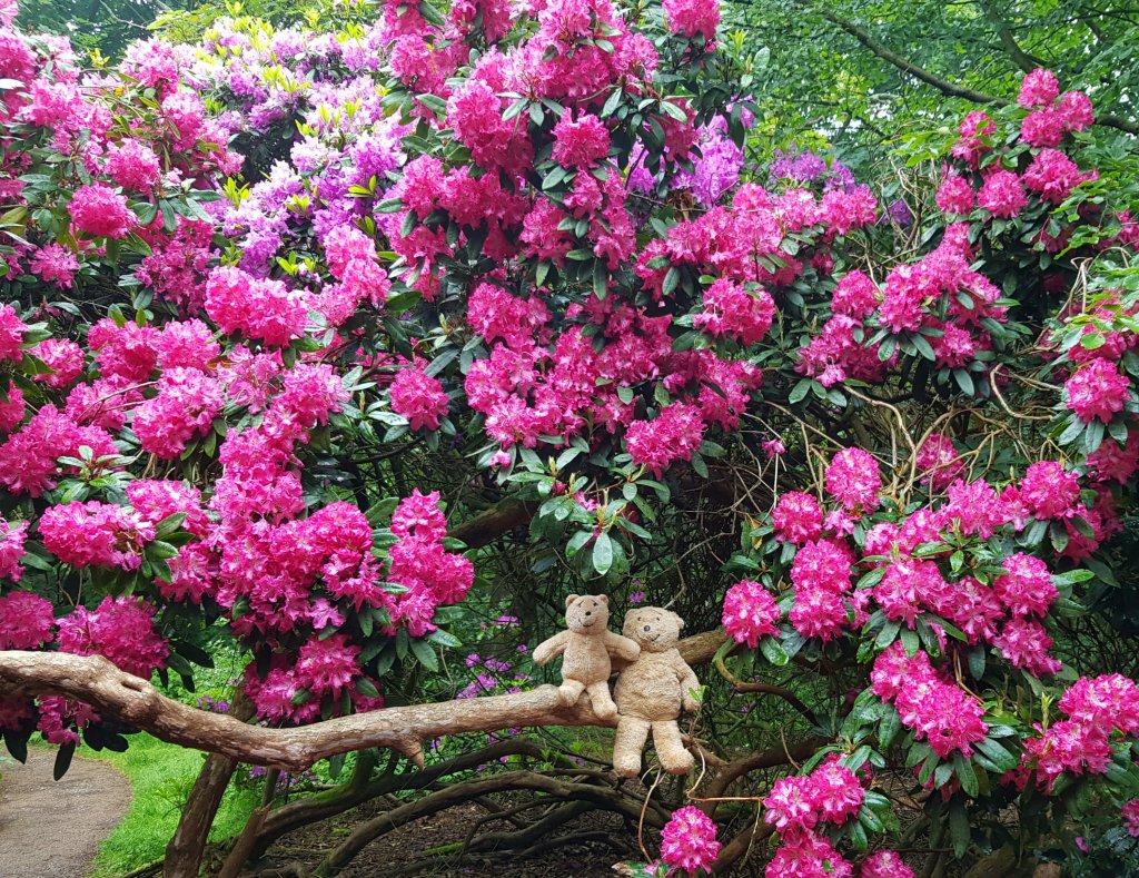 This bright pink Rhododendron had a branch in just the right place for two small bears.