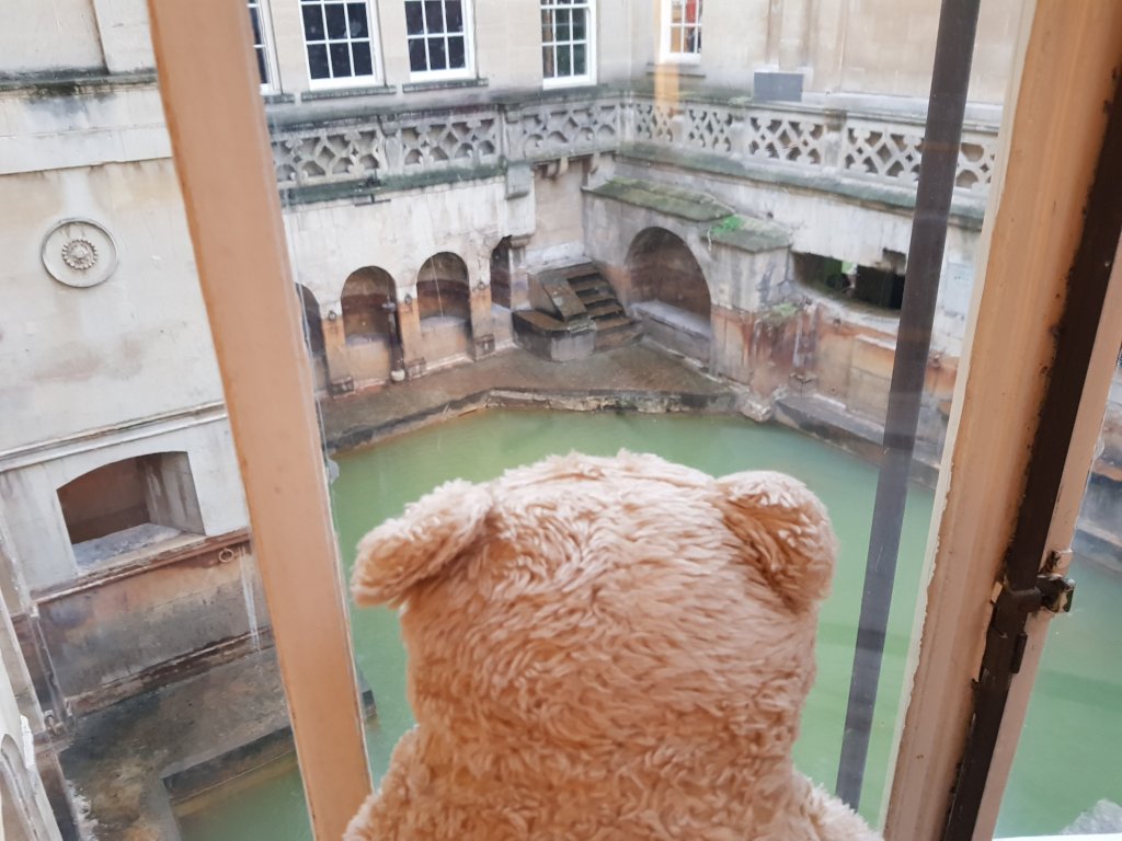 There is a splendid view of The Roman Baths from the Pump Room windows. I visited the baths a few years ago. (See https://horacethealresfordbear.com/2018/03/07/the-roman-baths-in-bath/)