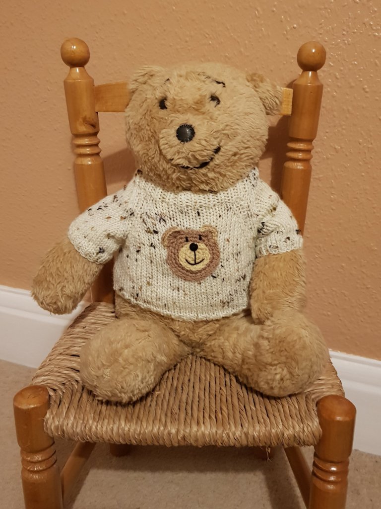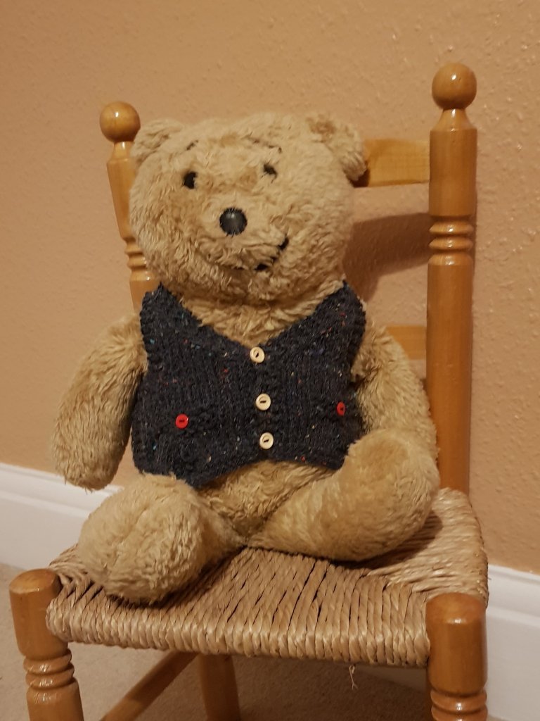 Last week I had to have a few stitches as several holes had appeared in my fur. I enjoy my adventures but don’t want to literally fall apart at the seams. So I have invested in a a jumper and a waistcoat to give my body some protection. Both have been handmade by a knitter who sells teddy Bear clothes on Etsy. Here I am in my splendid new jumper: