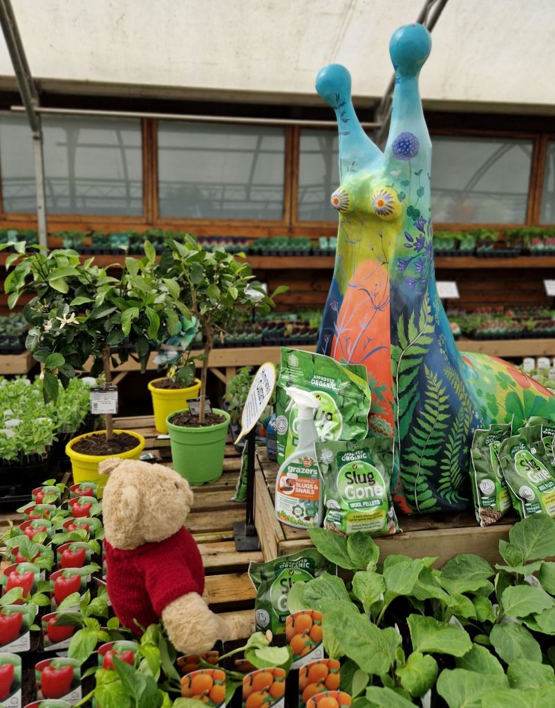 Custard the slug lives at the garden centre and he warns humans that others much smaller than him like to eat newly planted seedlings.