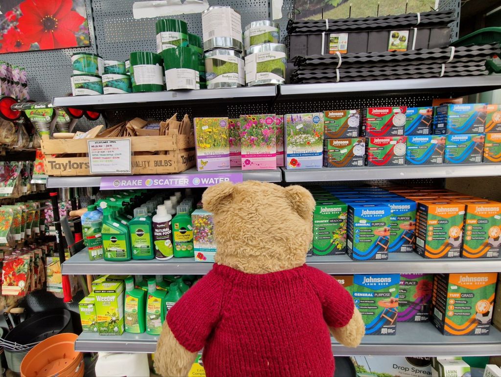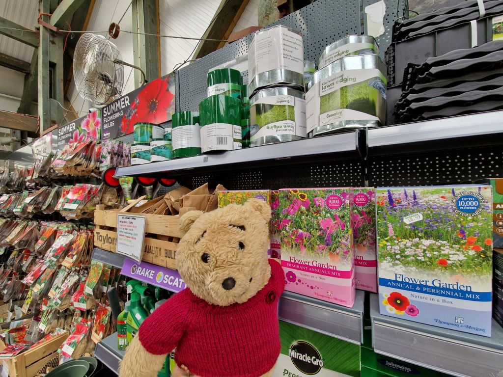 A fine sunny spring day often makes humans (and bears) think about getting their gardens looking good ready for summer. I was on a mission to find some flower seeds for our front garden, so off we went to the Riverside Garden Centre in Bristol.