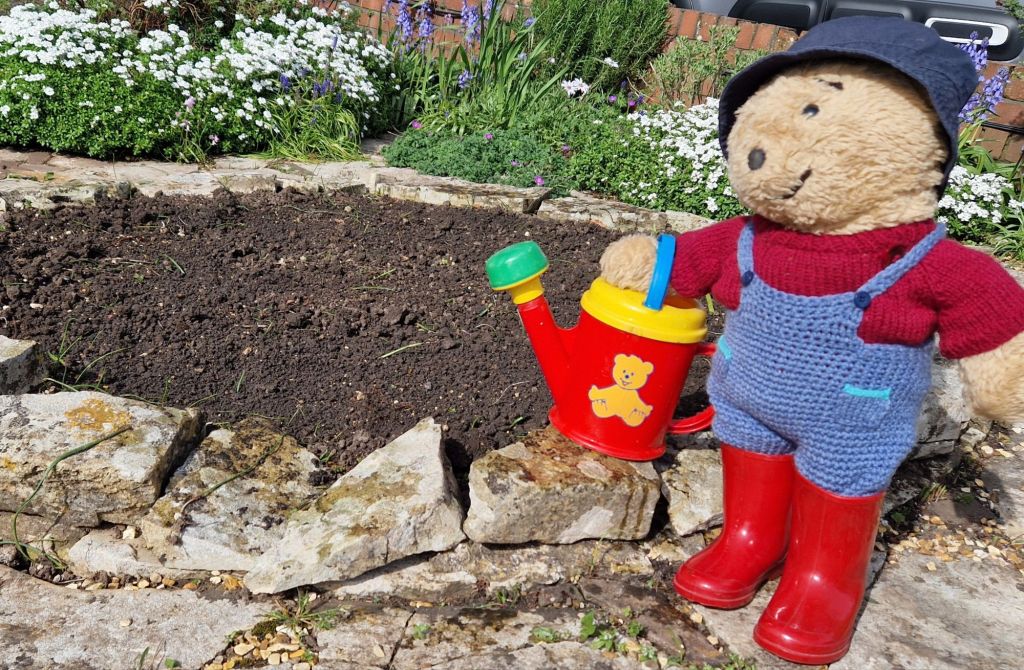 Once planted that was also watered in. I have a very special watering can that used to belong to my human’s daughter that is just the right size for a small bear!
