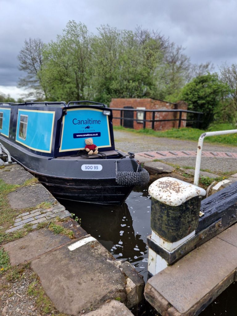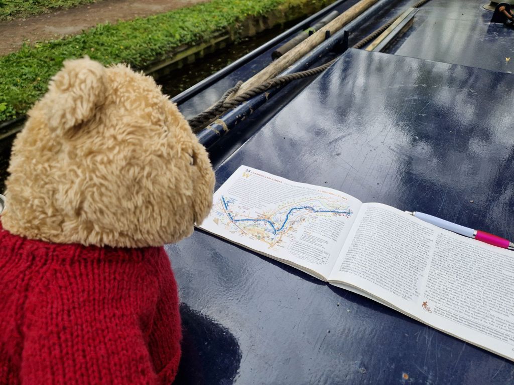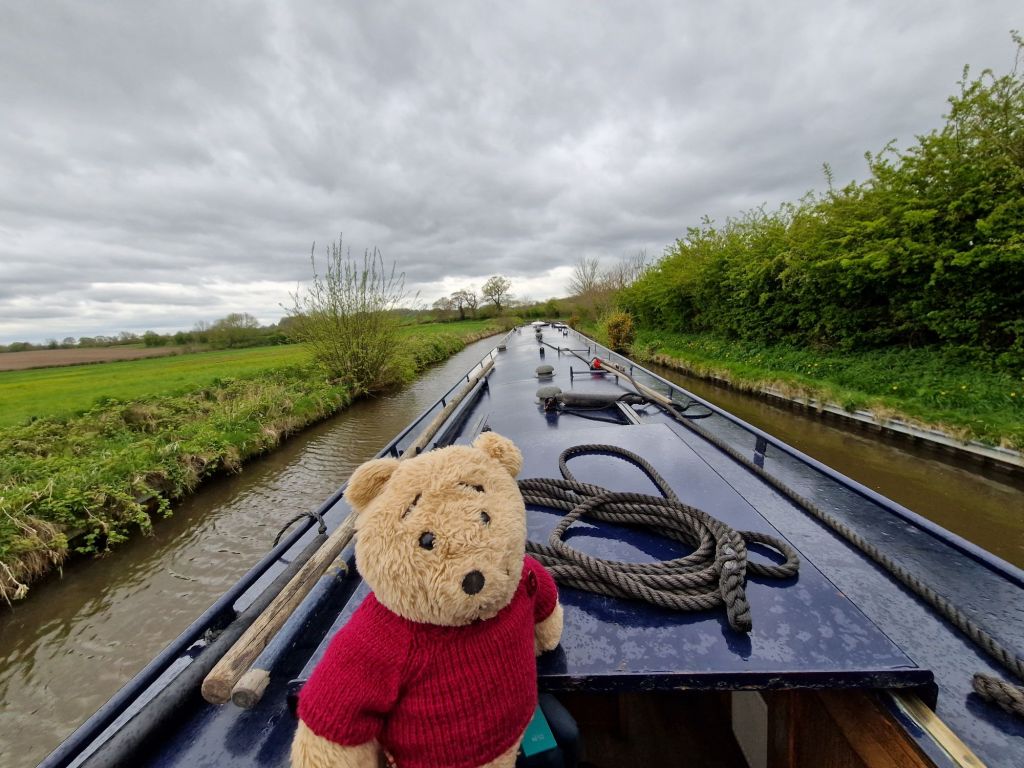 I travelled at the front on a bench just right for bears. I was able to keep a look out for the humans steering the boat at the back. Narrowboats are steered from the back using a tiller.