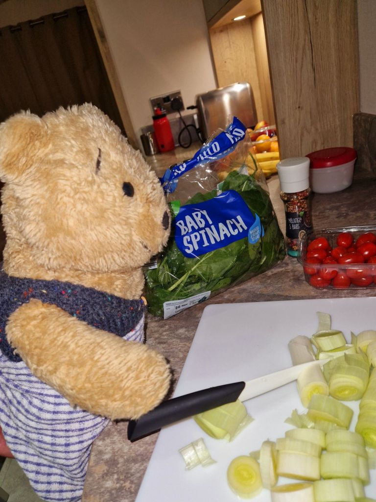 When the humans got back, with tired legs, I cooked a meal for them. I used what I could find in the fridge and started off chopping up leeks.