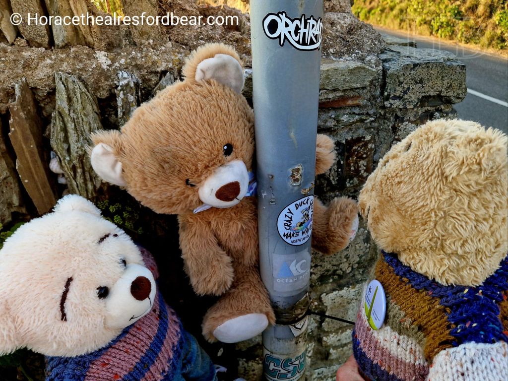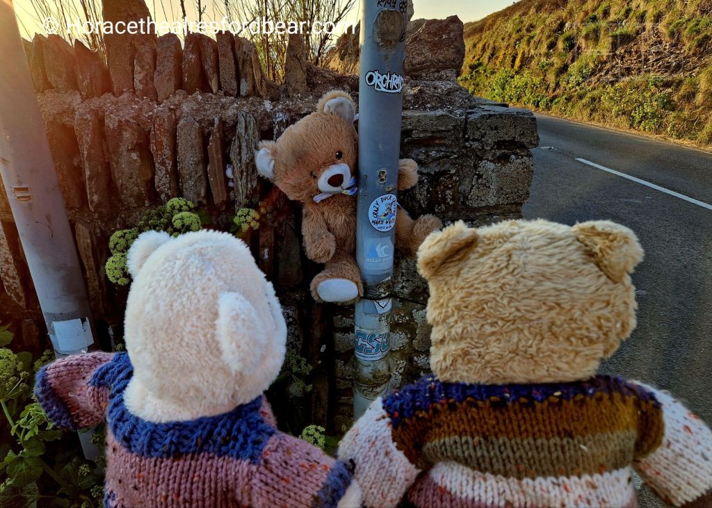 While walking along a short stretch of Croyde Road to get to the coastpath on the other side of the road we came across a very sad looking bear wedged behind a post. We were a bit concerned that a human might be looking for the bear so we said goodbye and continued our walk with the thoughts that we would check on the way back to see if she was still there.