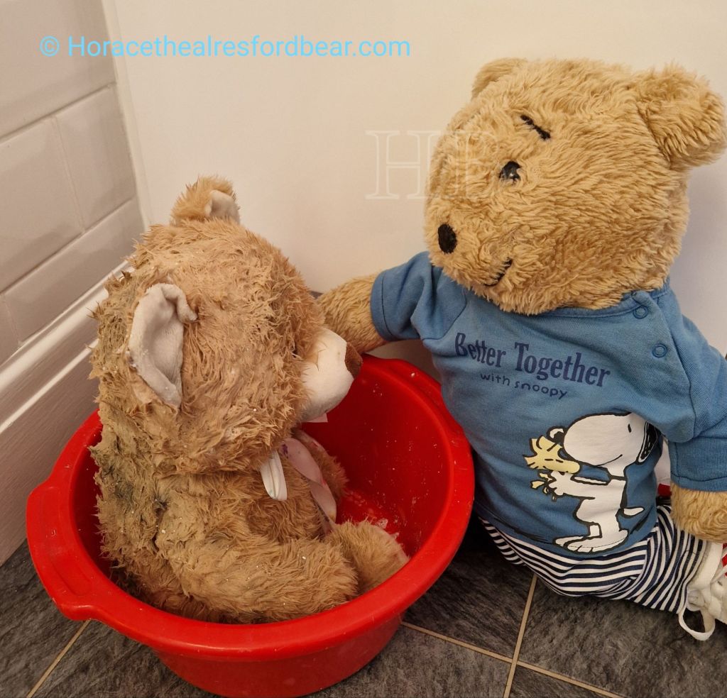 After rubbing some special bear friendly detergent (Aldi biological washing powder) into the badly stained areas Sandy sat in the bowl for a while to soak.