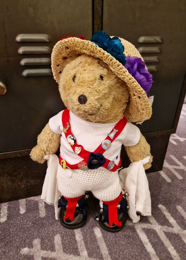 The sun was getting rather bright so I borrowed my humans sunglasses for a while. You may notice a new badge on my baldricks. It is a teddy bear and and says ‘I love Archie’. Earlier a Morris Dancer told us all about Archie, a bear who belonged to the poet Sir John Betjeman, and gave me the lovely badge.