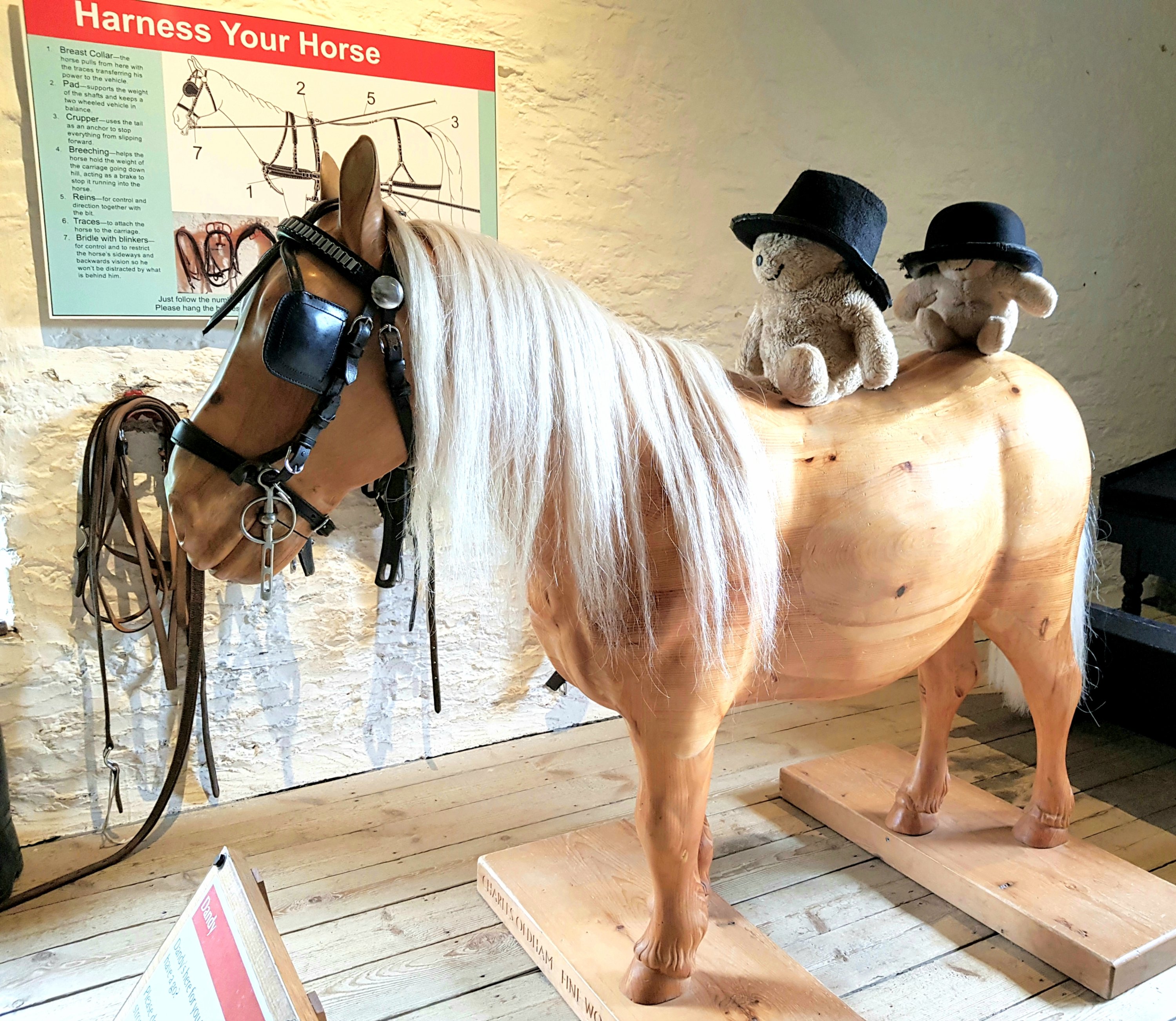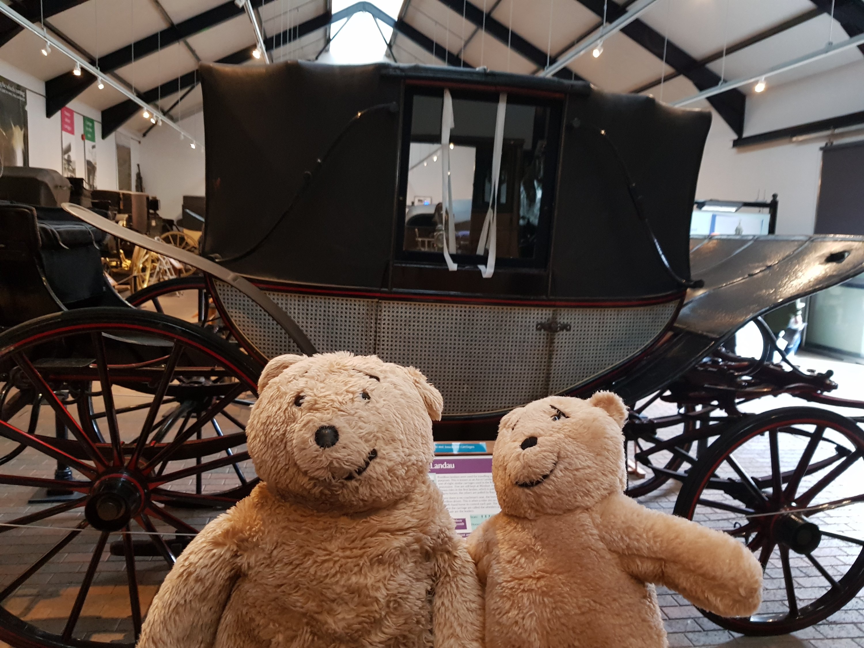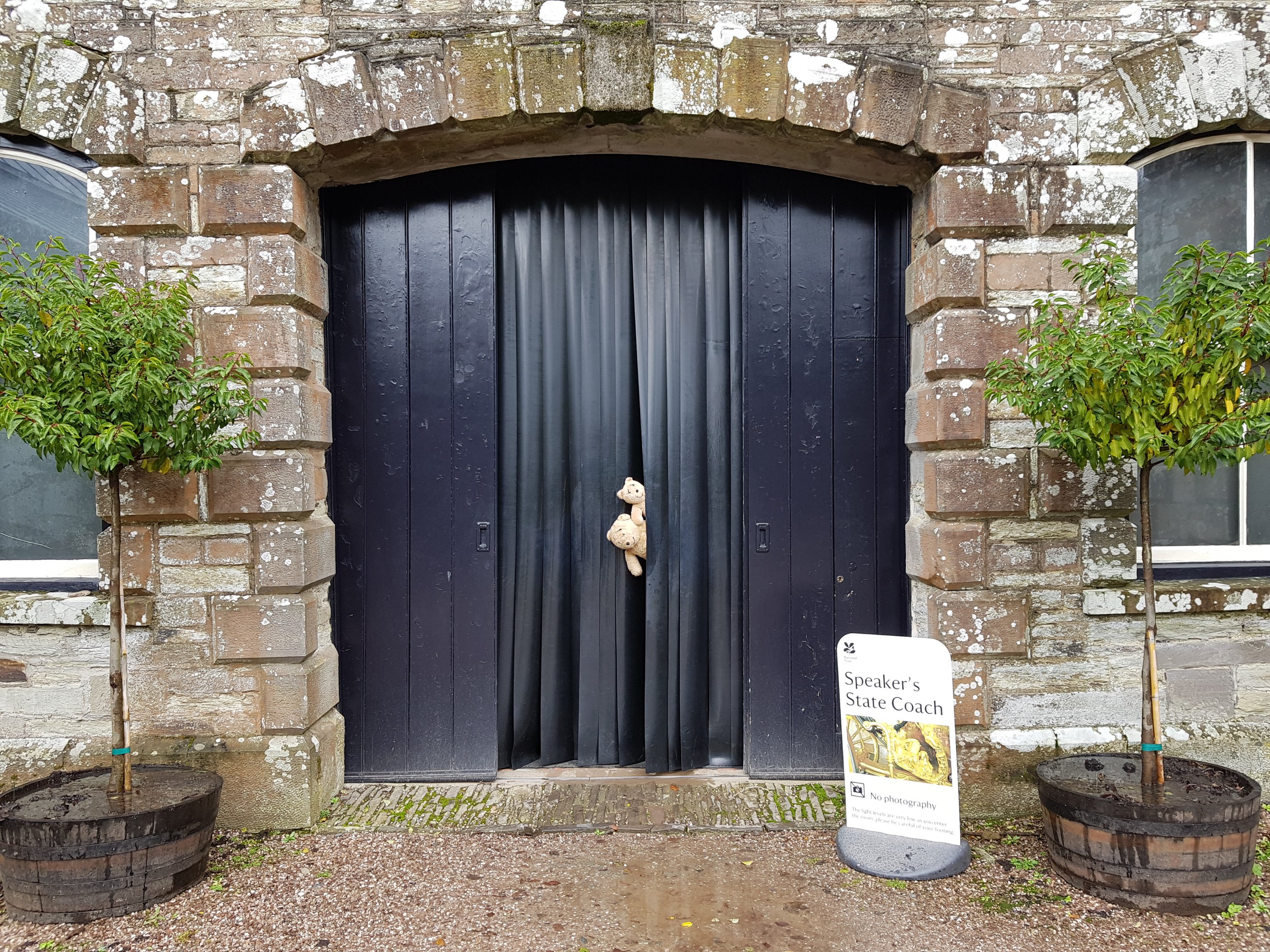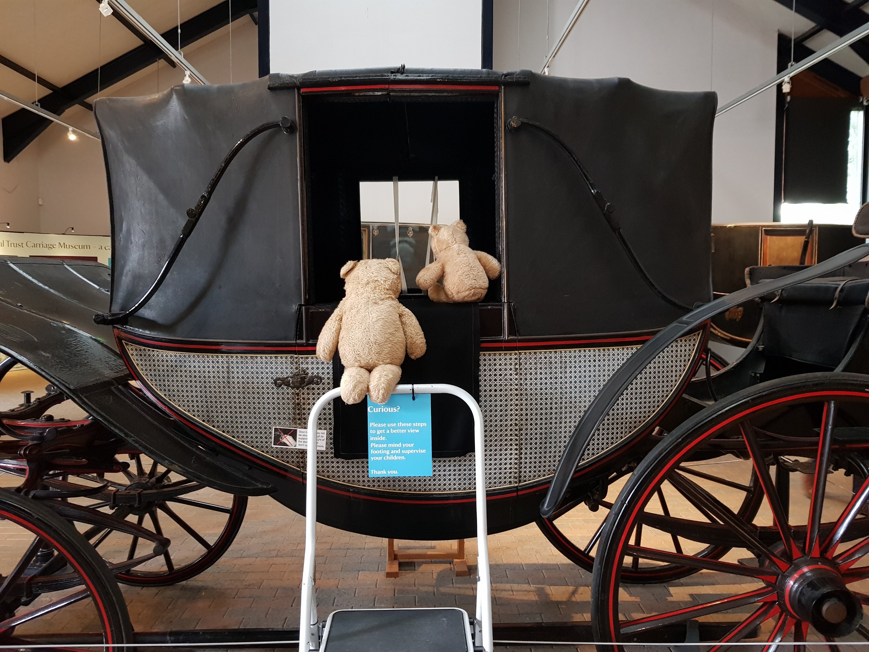 A very ornate gold carriage was hidden away in the dark with no photograph allowed. This carriage is The Speaker’s carriage and used to be used by The Speakers of the Houses of Parliament for special events. It was very big and ornate. Here we are peeping out; the carriage is behind the curtain!