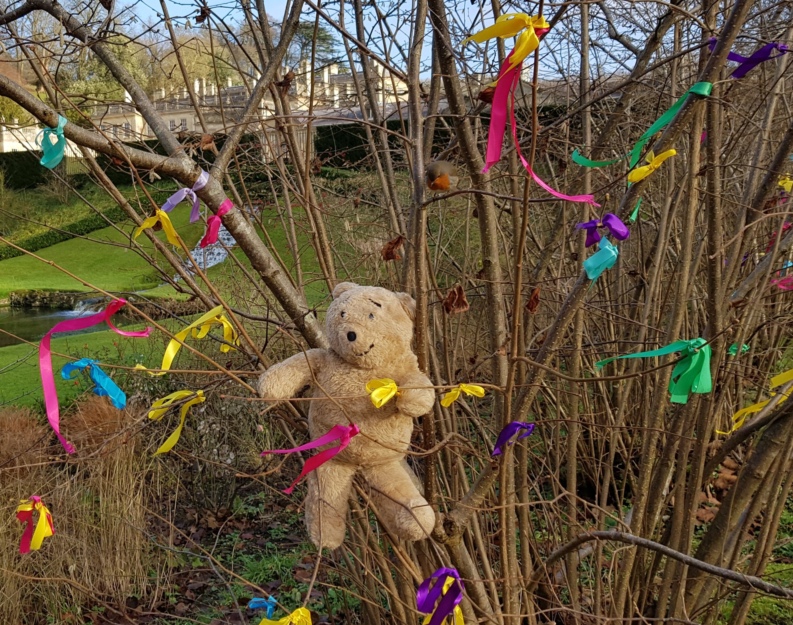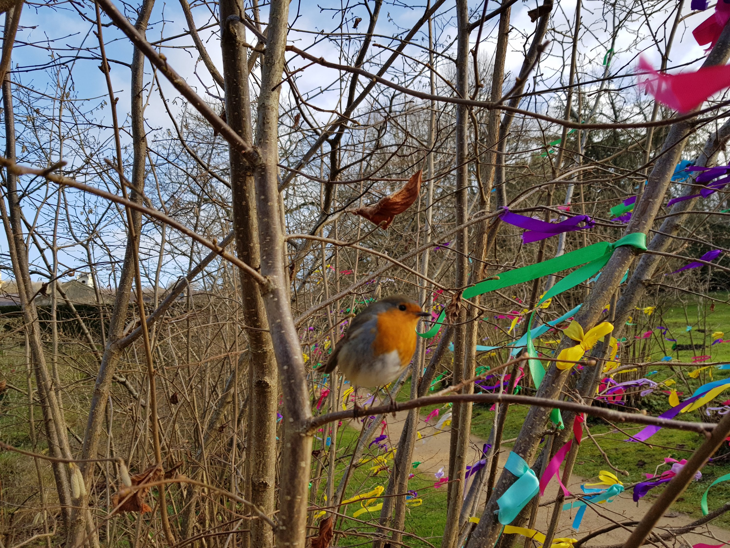 I selected a ribbon and tied it on a nearby tree. Can you spot the robin who was watching me?