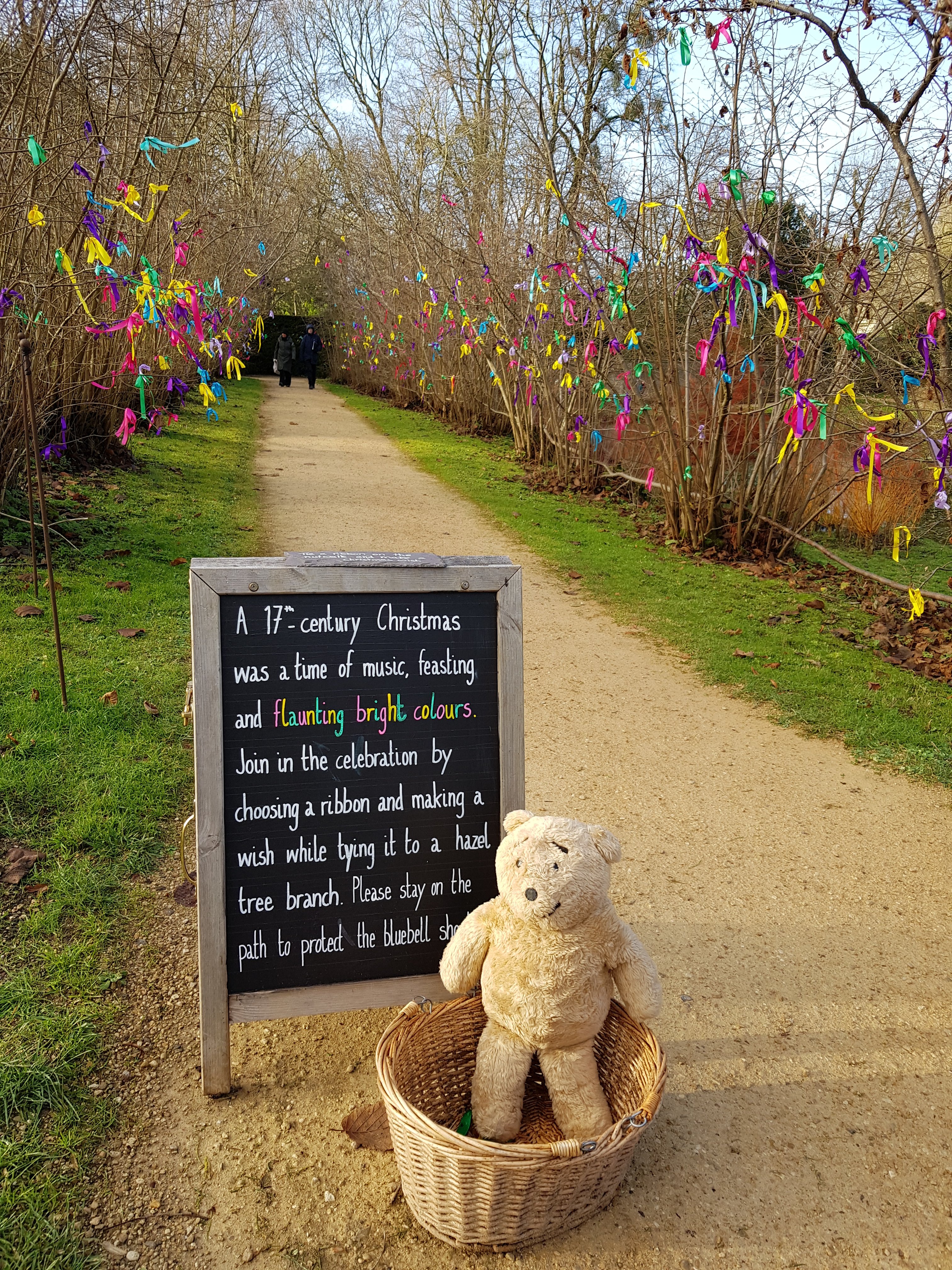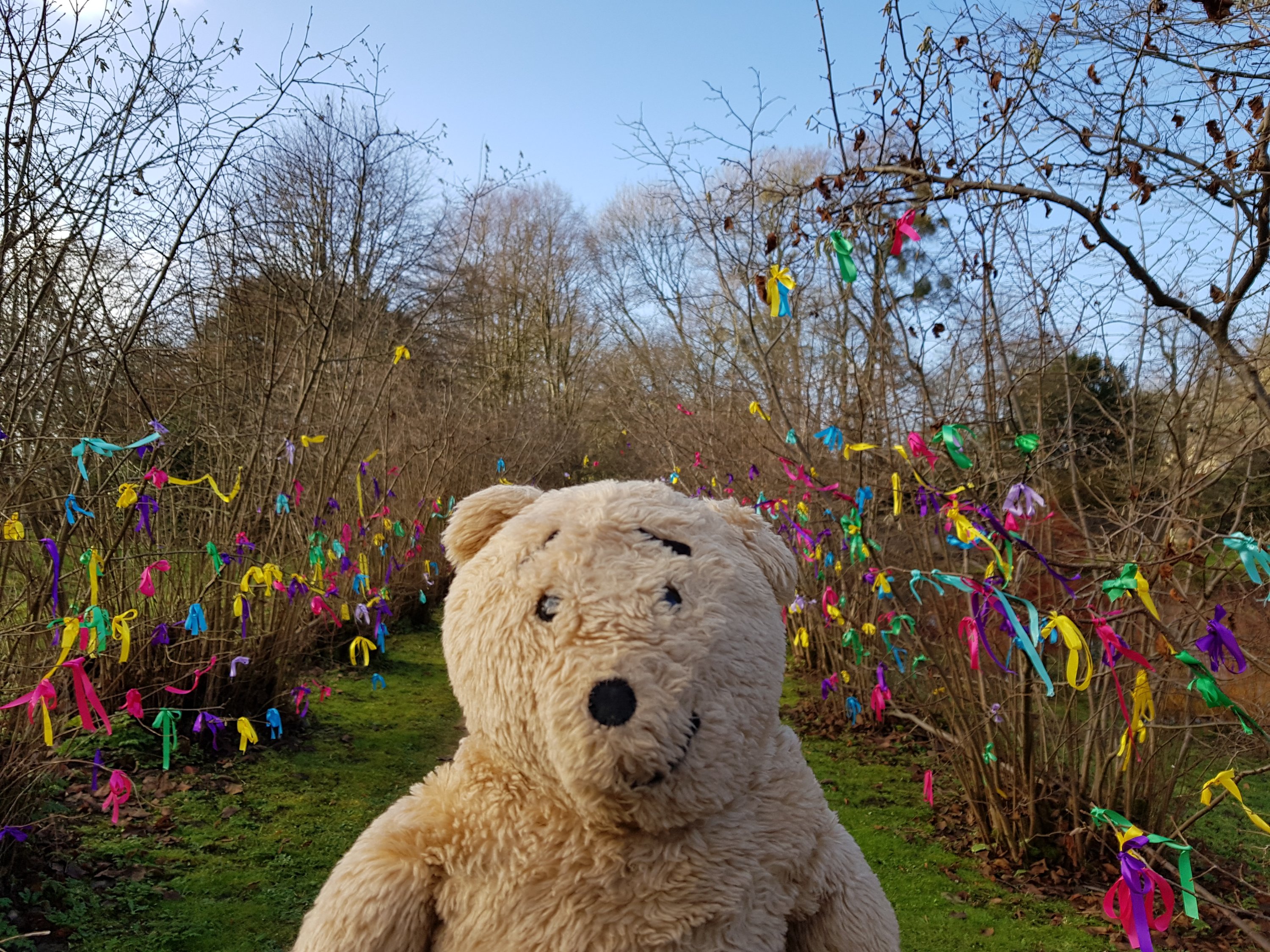 The formal gardens behind the house are sheltered from the wind so there I climbed out of the bear carrier. Humans had been busy decorating trees with ribbons.