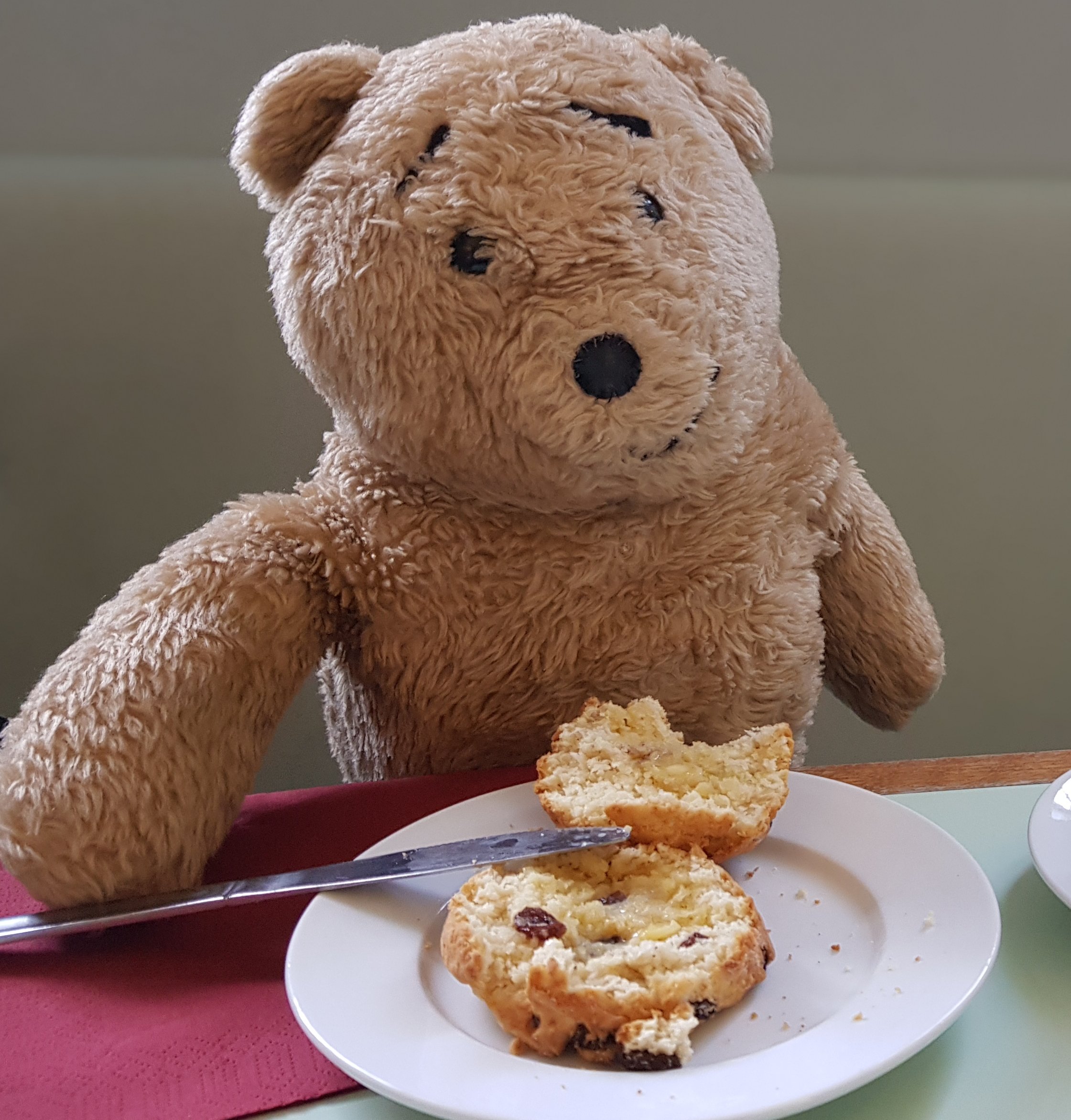 My grand human then rolled it out.We used cutters to create the tarts. I let my grand human put the jam into the tarts as jam and fur don’t go together very well.We put them into the oven and after about 20 minutes they were cooked.After letting them cool on a rack I put them all on a pretty china plate.Shortly afterwards it was tasting time.Yum yum yum; though my grand human thought the pastry was ‘a bit hard’. We will have to try again sometime!Horace the Alresford Bear 2/4/2020