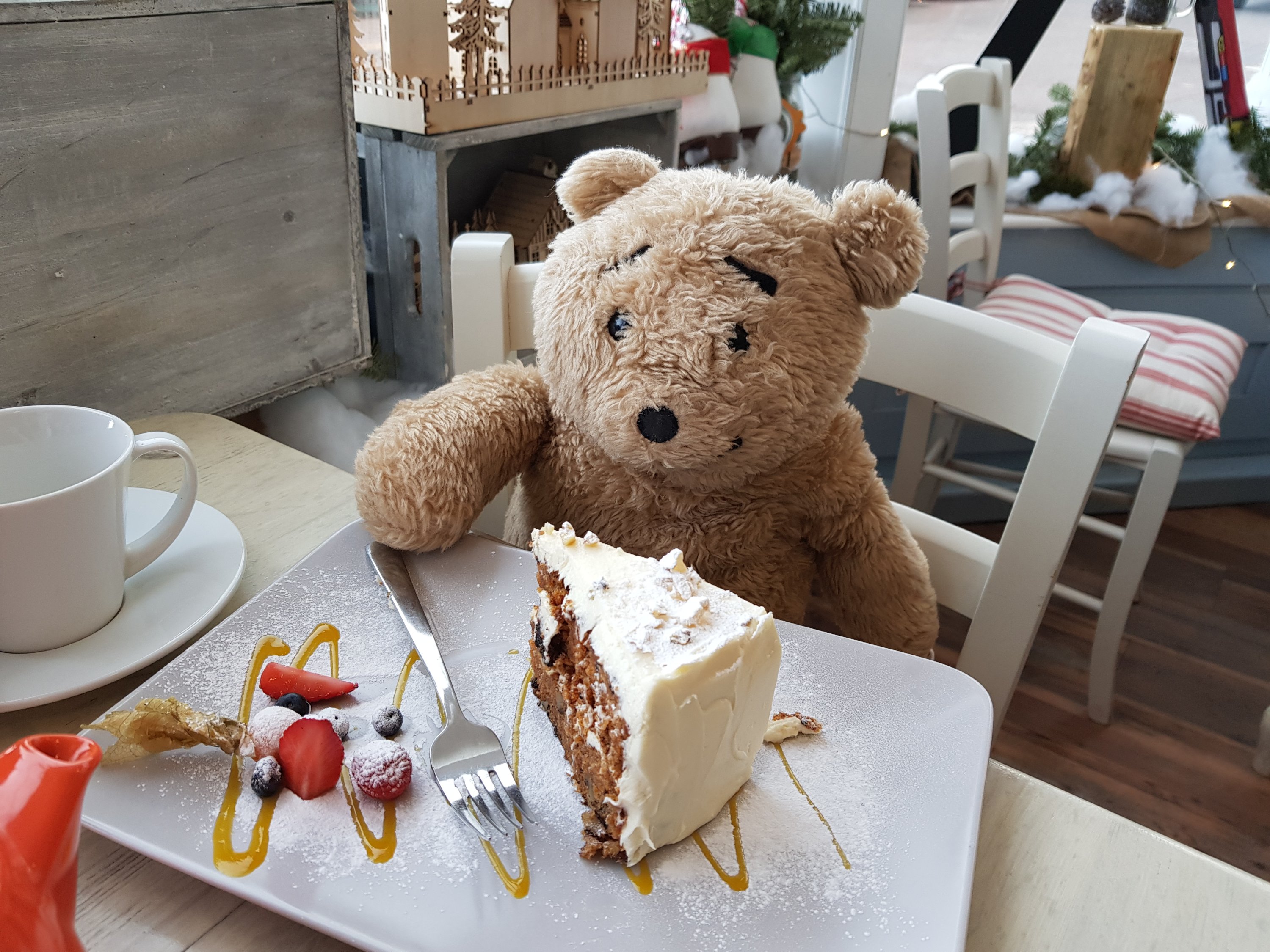 The humans thought tea and cake would be good. We soon found a cafe.