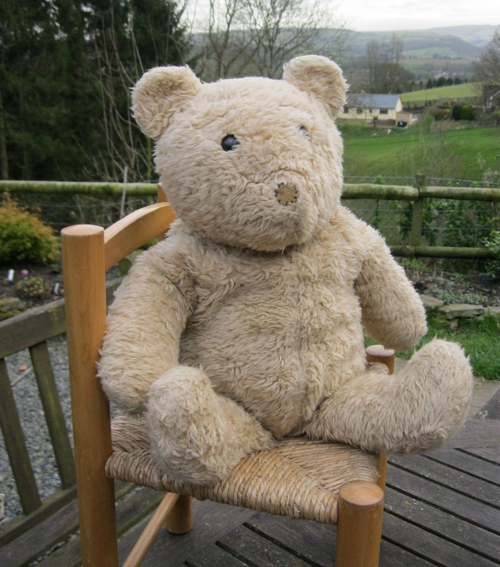 I bought the eBay bear in your fourth photo, the bear sitting outside on the chair. His name is Godfrey. Since he came to live with us, he’s visited Alresford, because I was growing up there when he was born in the 1970s.