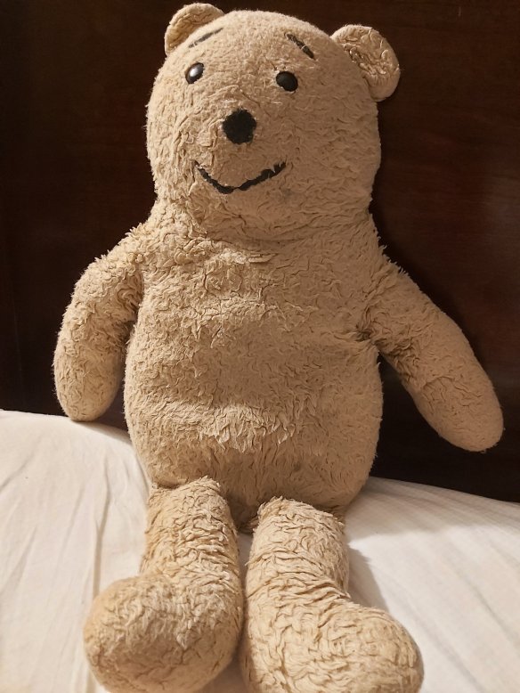Here’s Hugo. His human, Gill has bought him as a brand new bear in the very early 1980s.