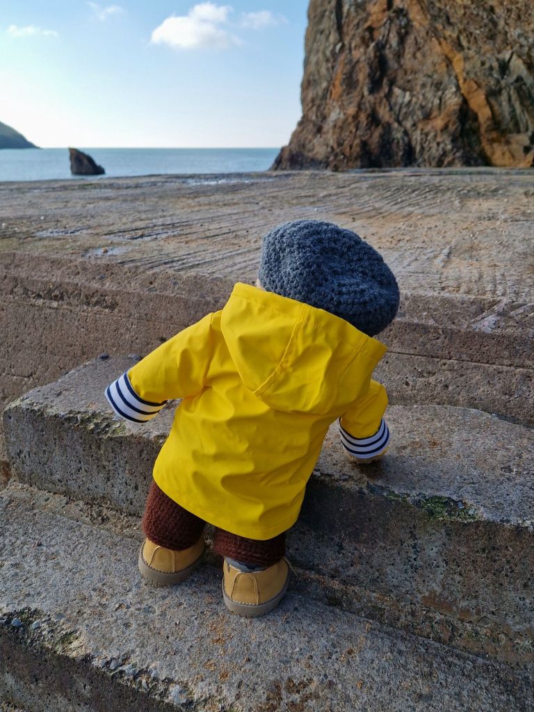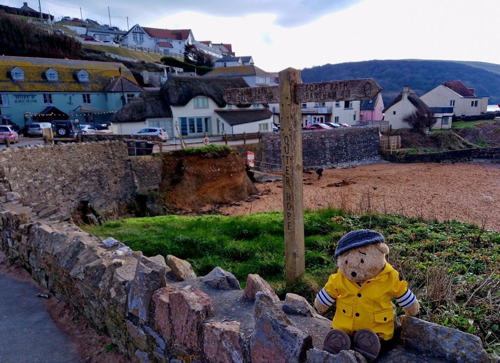 After walking back to Outer Hope my human suggested a photo, I was a tad tired and kept getting blown over by the wind so I sat down.